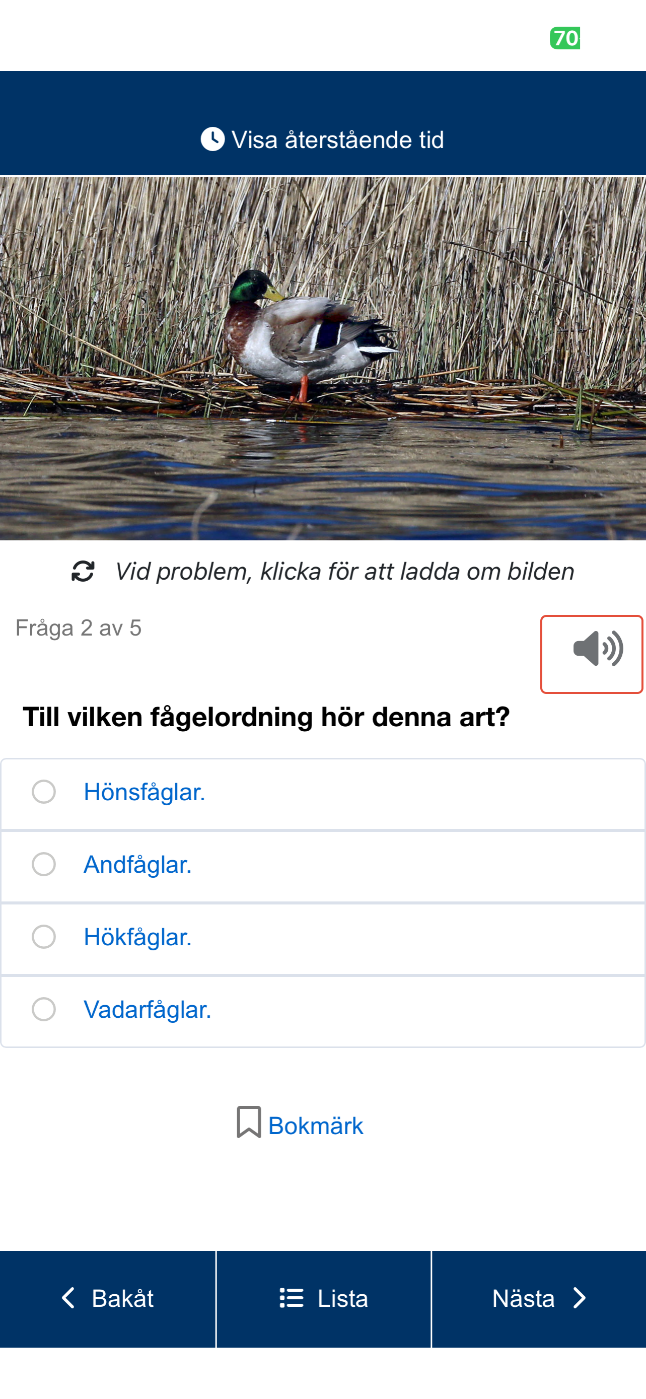 - Ljuduppläsning av frågor och svarsalternativ finns tillgänglig på svenska. För att spela upp ljud, klicka på ljudikonen till höger (som markerat på skärmdumpen).